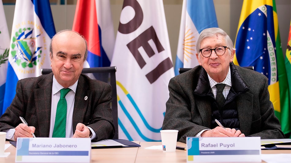 En este contexto, la sede de la OEI en Madrid acogió un acto en el que Mariano Jabonero, secretario general de la organización, y Rafael Puyol, presidente de UNIR, han suscrito un nuevo convenio de cooperación académica. El acuerdo refuerza una alianza interinstitucional consolidada y permitirá que los beneficiarios de las becas realicen programas formativos en línea impartidos por UNIR.